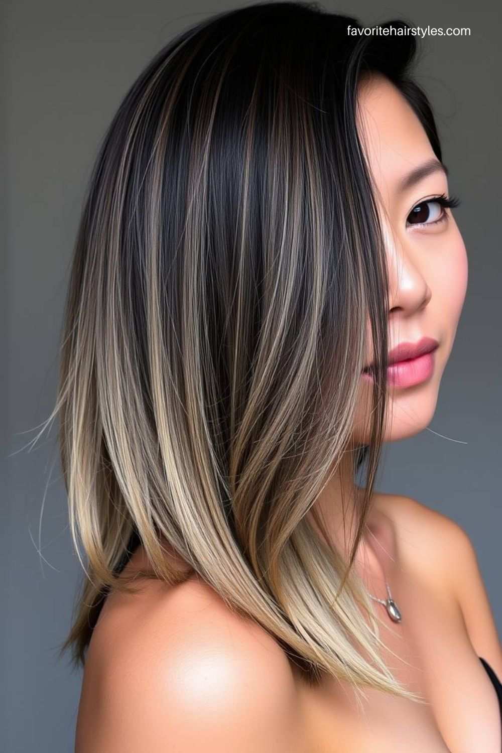 This subtle version blends a light ash brown into dark Asian hair for a smooth, natural gradient. It’s perfect for beginners who want a soft change without going too bold.