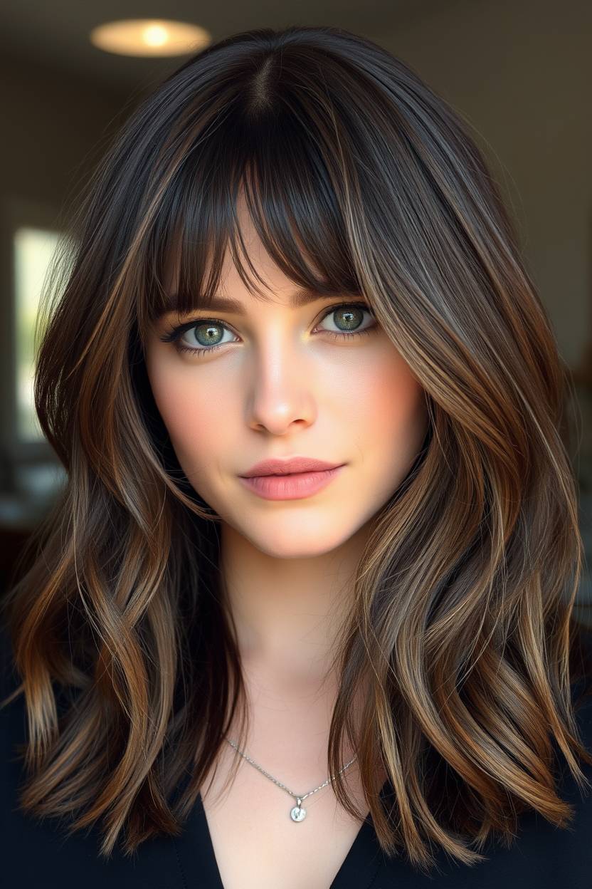 Pairing ash brown balayage with curtain bangs gives medium hair a trendy, 70s-inspired style. The color enhances the flow and shape of the bangs while adding softness.