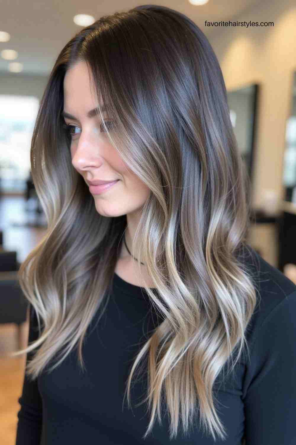 Long wavy hair with ash brown balayage gives a beachy, effortless vibe. The color highlights the texture of the waves, making your hair look voluminous and full of life.