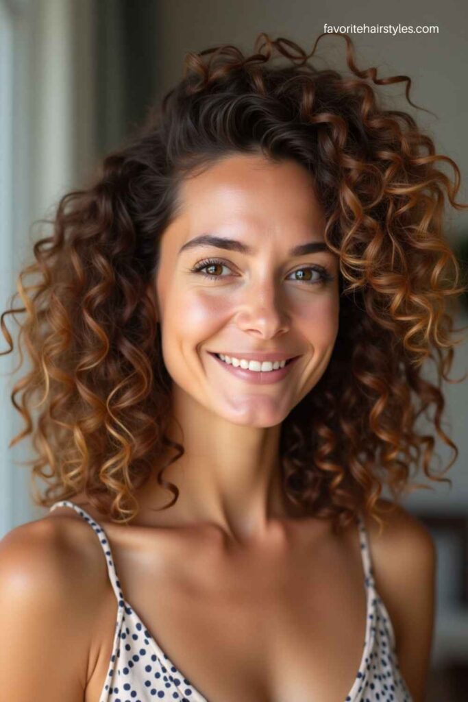 Strategically placed ash brown pieces around the face help brighten your features and make your curls pop. This is a great option if you want to experiment with balayage without committing to a full head of highlights.
