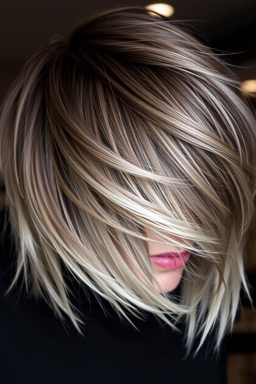 Chunky, icy silver streaks provide a high-contrast look against the muted ash brown base. It’s ideal for those who want something eye-catching and dramatic.