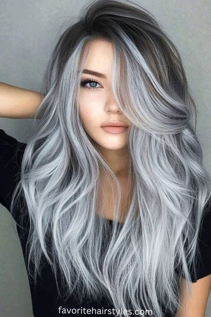 Balayage Hair Grey Ash Blonde that include dark root melting into ash grey ends provide a dramatic, high-contrast look. The darker base helps anchor the color, while the grey tones add edge and elegance.