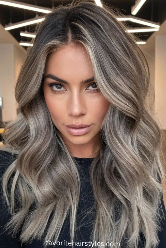 Balayage Hair Grey Ash Blonde make long, wavy hair come alive when rich ash grey hues are used throughout the lengths. The flowing waves enhance the color shifts for a mesmerizing effect.