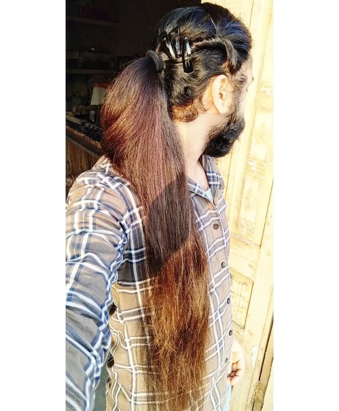 Long flowing ponytail is a perfect ponytail that suits men who desire to display volume and length of hair. The hair is loosely tied together to flow freely down the back, and it creates a dramatic and stylish effect. Hair is healthy, shinyy and frizz-free with regular conditioning and moisturizing. Such style includes medium to long hair and can be customized to casual or formal. It reduces the focus on middle-mind, hair security,ty and personal style but is low-maintenance as compared to other complicated ponytail styles. Ideal among men who desire to look bold and still classy.