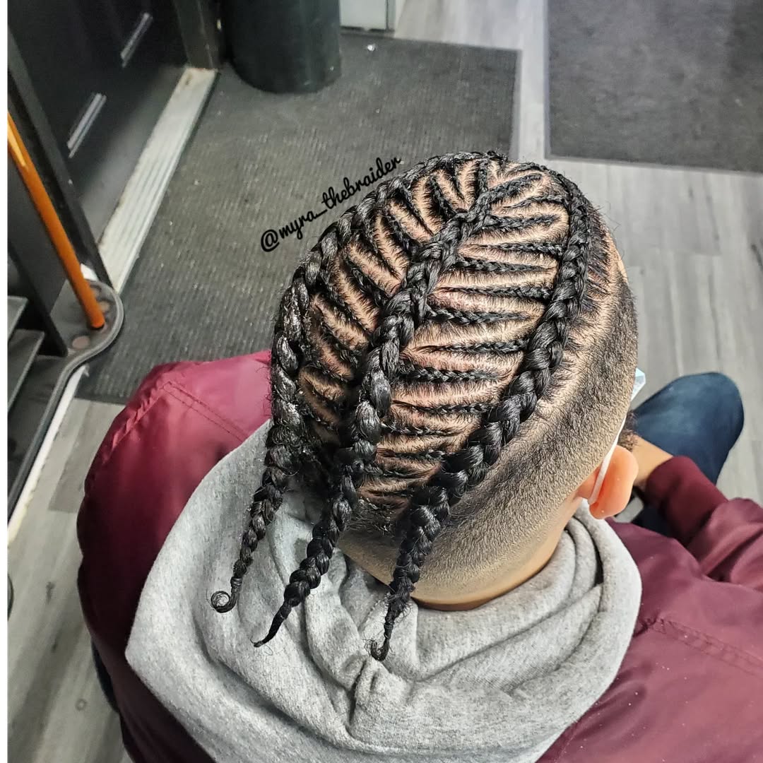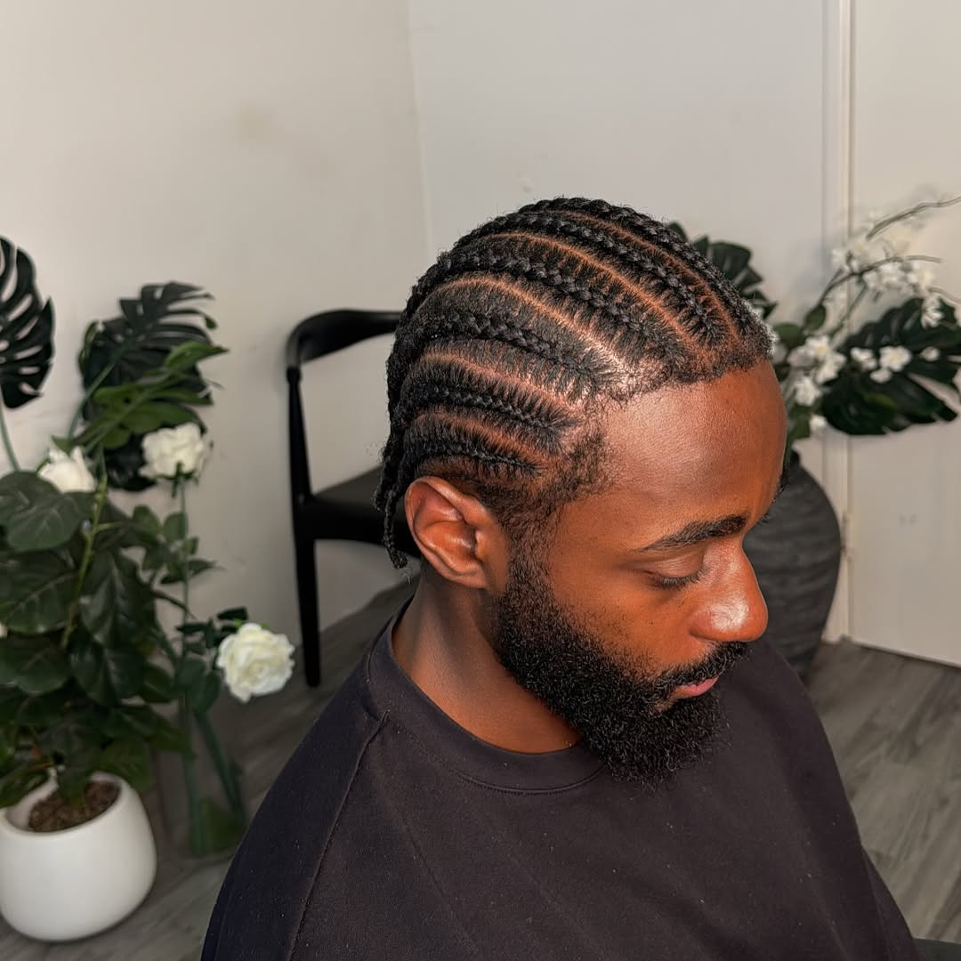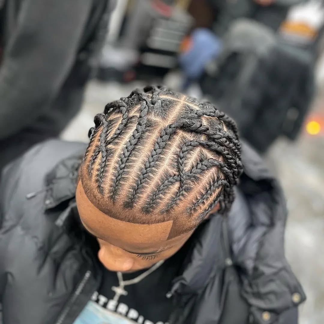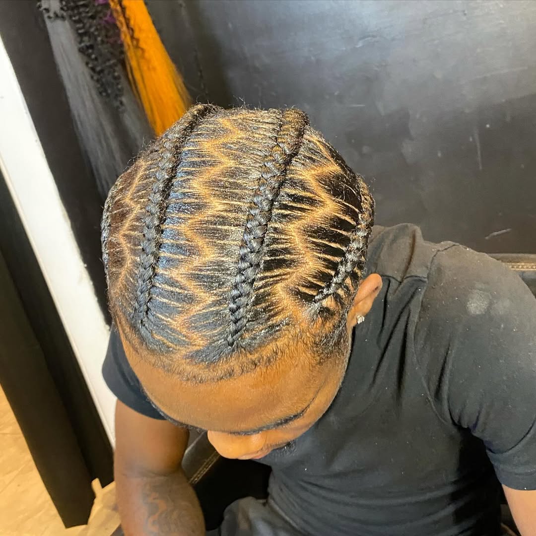 Cornrows are a modern improvement of Zigzag Braids. The hair is parted and instead of straight lines,s; it is twisted in zigzag patterns, which adds a special artistic touch. It is a unique hairstyle because of its attention-grabbing design and coolness. It suits men who prefer to use their hair to show their personality. Zigzag braids are most effective when used with clean edges and when taking care of the scalp. Regular moisturizing and nighttime protection on this style will keep it fresh and stylish even after weeks, hence making the style simple to maintain.