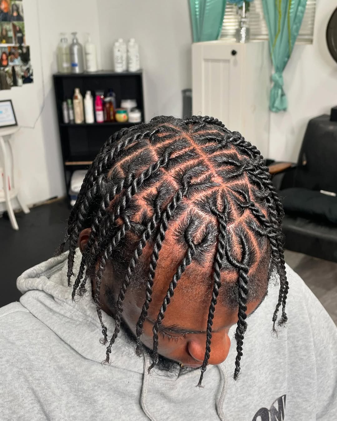 Twist braids are a combination of twisting and braiding styles and produce elaborate and fashionable patterns. The hair is a style that fits men who like outstanding and artistic styles. Twist braids may also be as simple as rows or as complicated as multiple patterns of parting. They not only keep the hair healthy and stop it from getting frizzy, but also appear to keep the hair length and look sleek. Twist braids are suitable for long and medium-length hair, and they need adequate moisturization and retwisting regularly to hold their structure. Twist braids are popular with men who desire to have a unique, stylish hairstyle that gives them protection and versatility in their style choices.