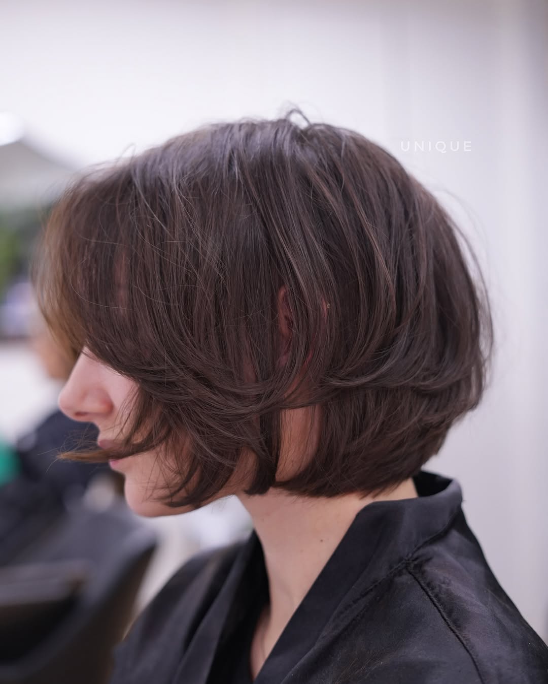 The bob bowl with micro bangs is fashionable and a trendy short bob with the round shape of the classic bowl cut. Micro bangs are extremely short and form a bold, rebellious difference. Layers also make the shape softer and bring it to motion, avoiding the impression of a stiff haircut. This style suits best under straight to wavy hair and applies to small to medium face shapes. Finishing the look with styling products such as smoothing oils or texturizing sprays helps to refine the look. Micro bangs and layers require regular trims in order to be precise. It is perfect in an eye-catching, contemporary look.