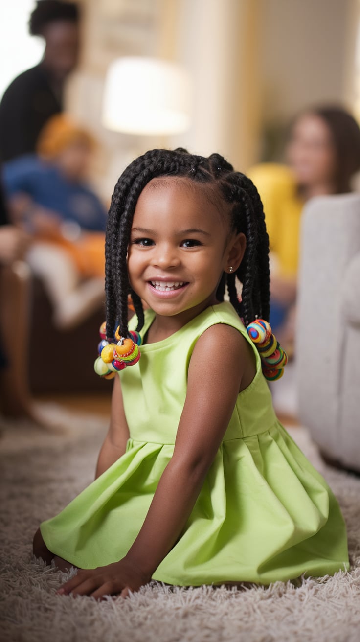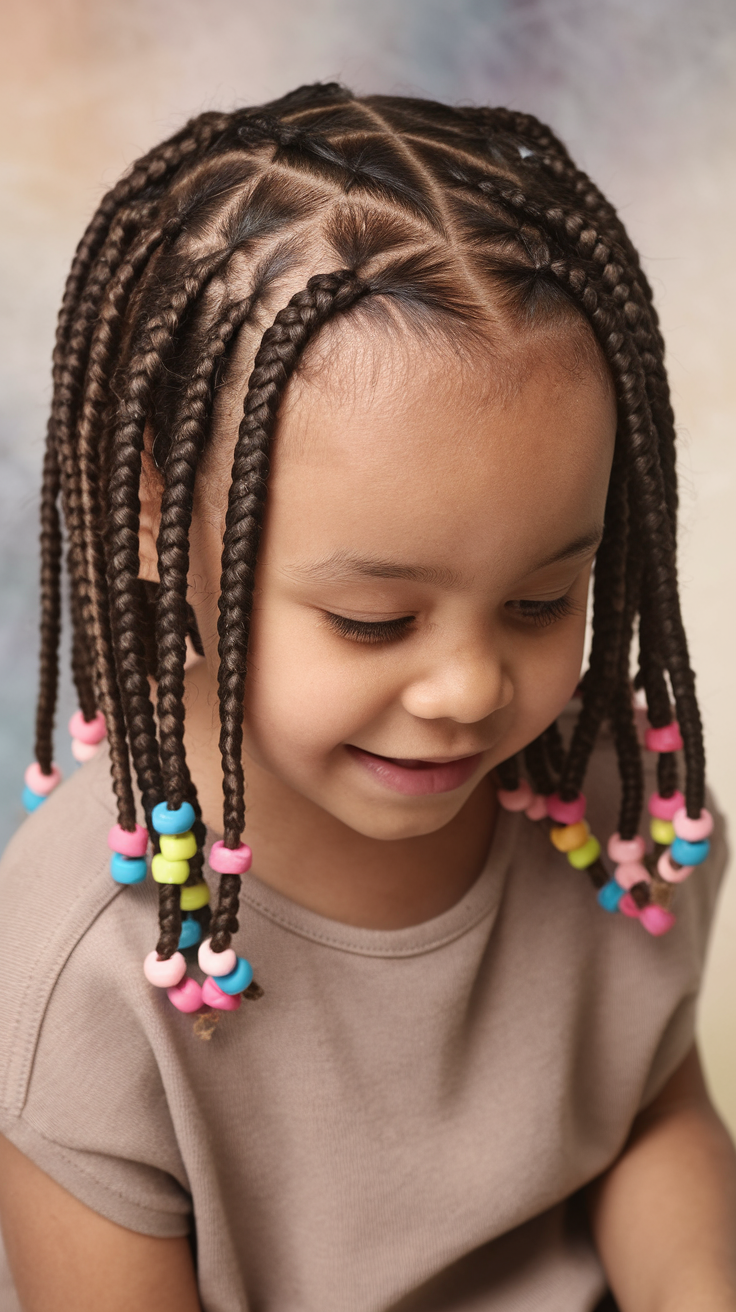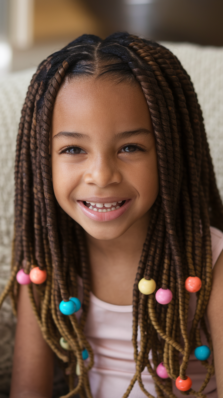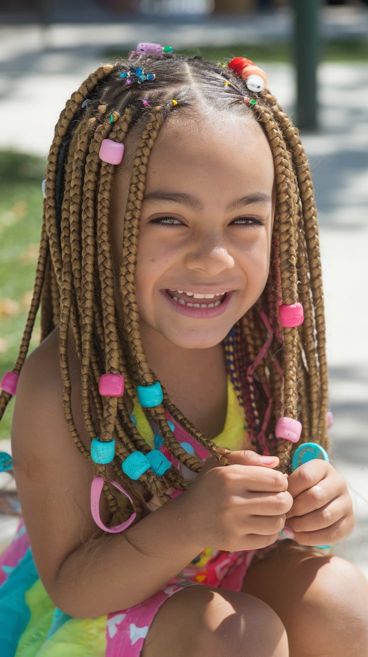 Box braids with beads are such a vibe! I remember the first time I added beads to my daughter’s braids—she shook her head back and forth just to hear them click. That little jingle when kids run around is honestly the cutest thing. You can play around with colors too, matching them with outfits or school spirit days. The beads just add so much personality to an otherwise simple style.