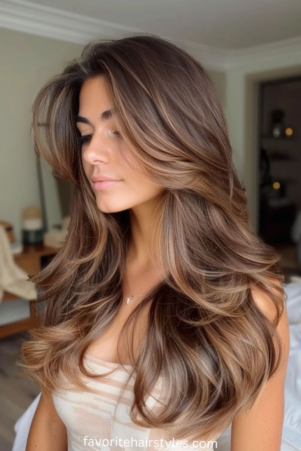 Brown Hair Ideas For Long Hair: A soft brown base paired with golden highlights provides a natural, glowing look. This combination is ideal for anyone looking to add warmth and radiance to their long hair without a dramatic change in color.