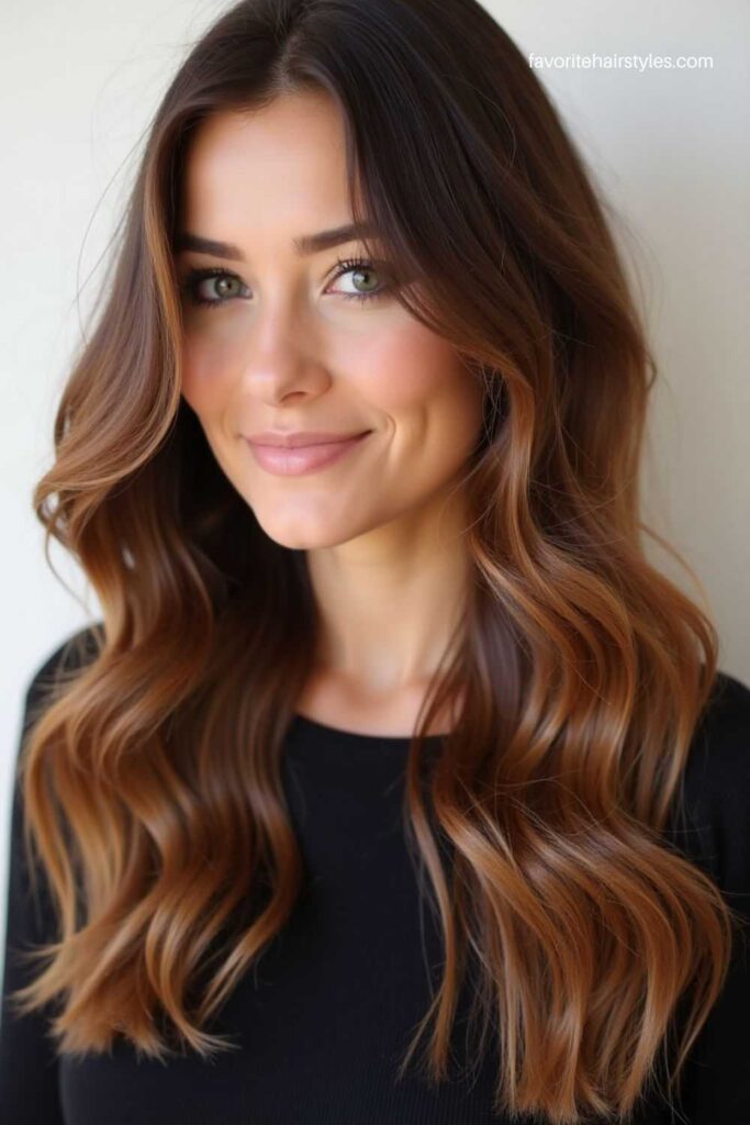 For a more romantic look, long soft waves work beautifully with caramel brown hair and highlights. This style allows the light highlights to blend with the darker shades, creating a soft and flowing effect that’s perfect for special occasions.