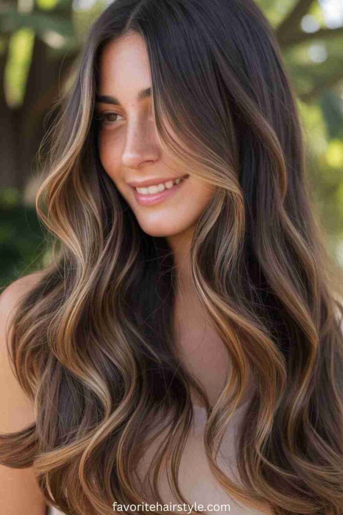Caramel balayage highlights add a warm, sun-kissed glow to chocolate brown hair. This technique blends soft caramel tones with the base color, creating a natural, seamless transition that brightens your look without harsh lines.