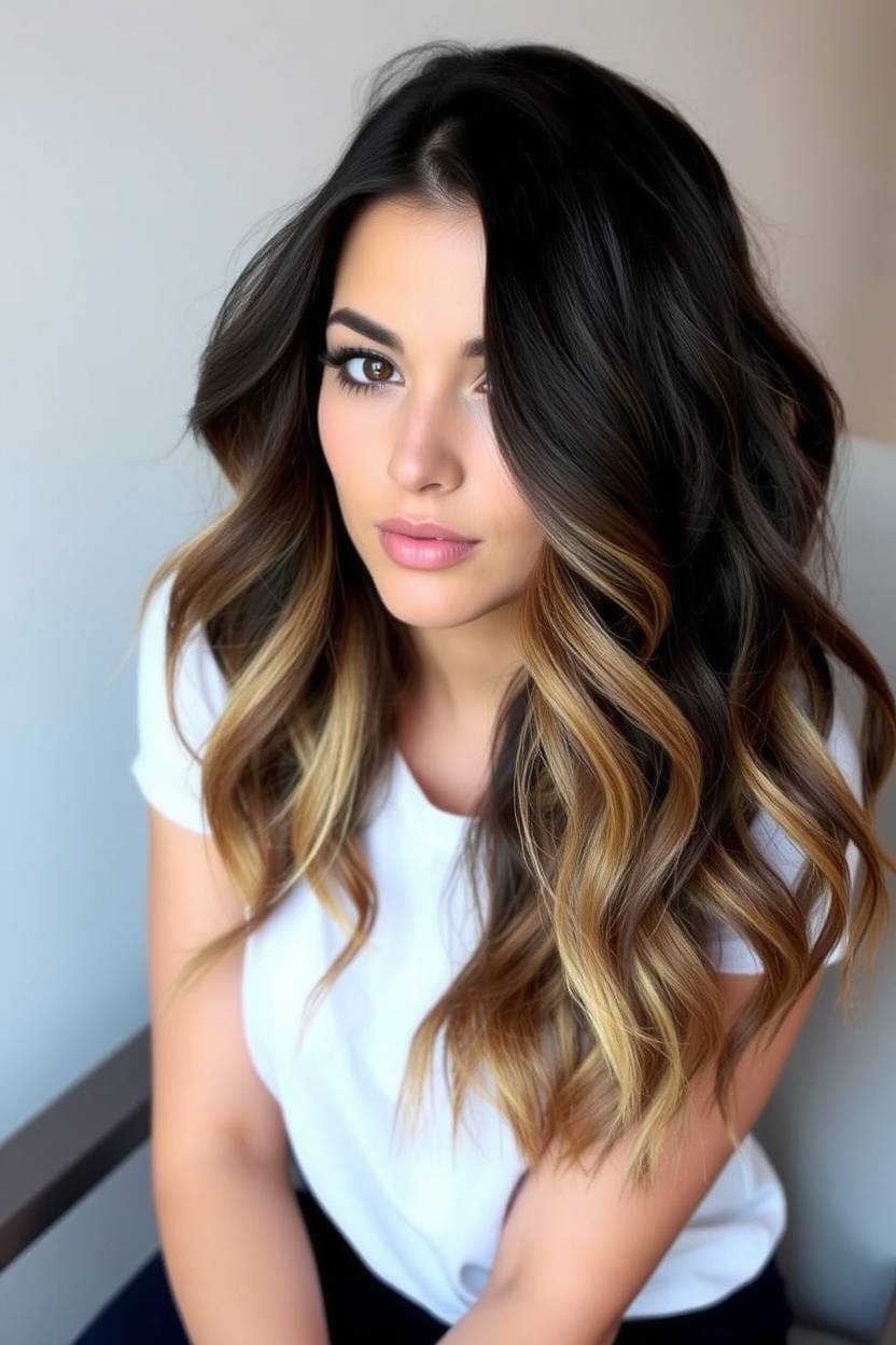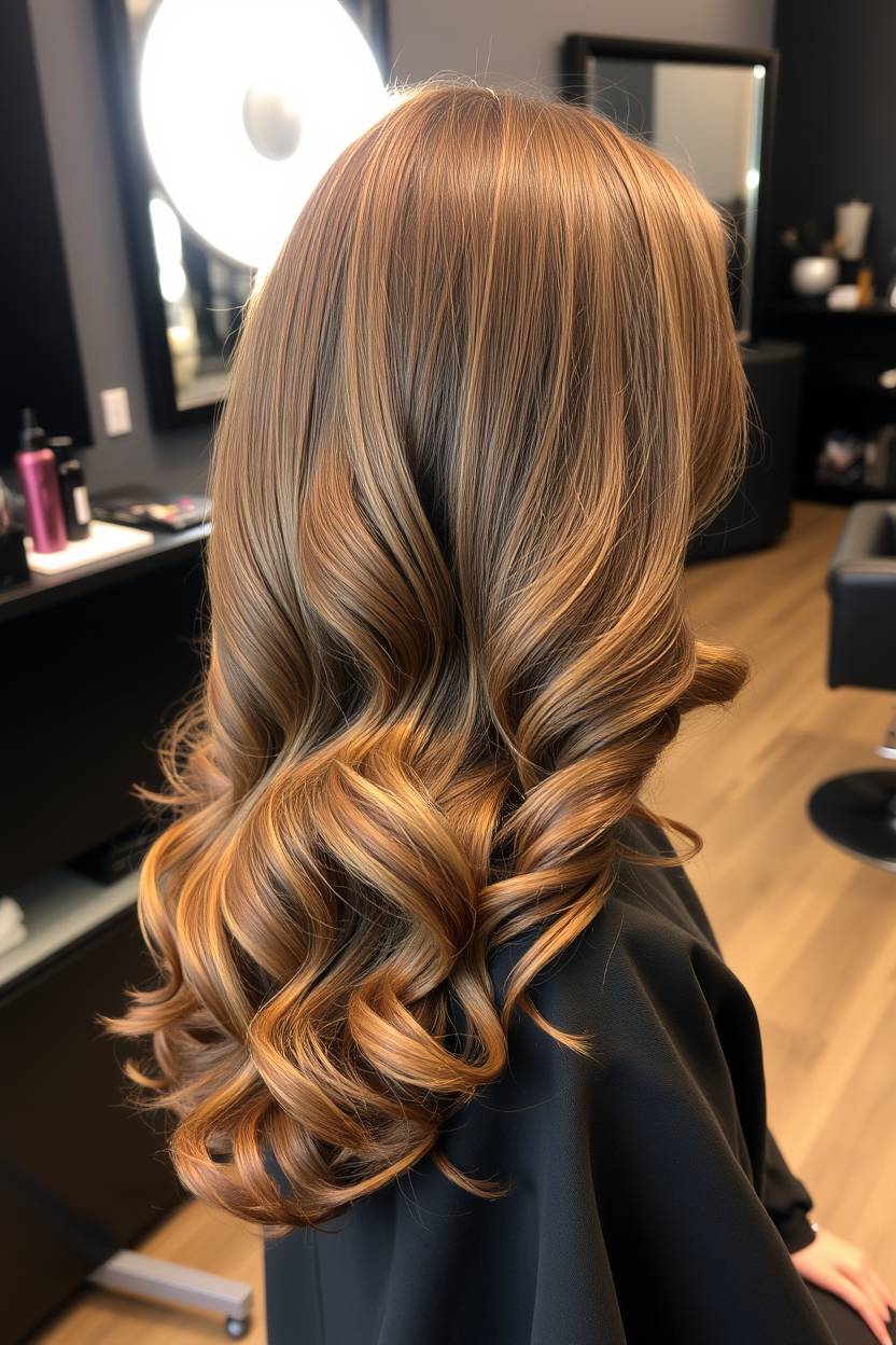 Soft waves or loose curls bring out the contrast between the chocolate base and caramel highlights, adding movement and depth.