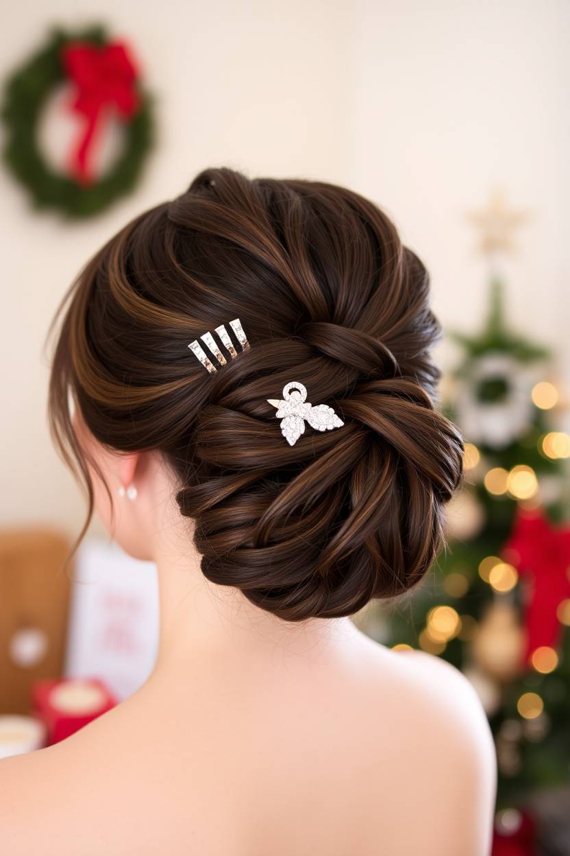 Now this is my go-to for more formal holiday events. It’s classy, it’s polished, and the ribbon gives it just enough flair to still feel festive. I once did this style for a Christmas gala shoot where the model wore a velvet green dress, and when I wrapped a gold satin ribbon around her low bun—it was everything. Just elegant perfection.