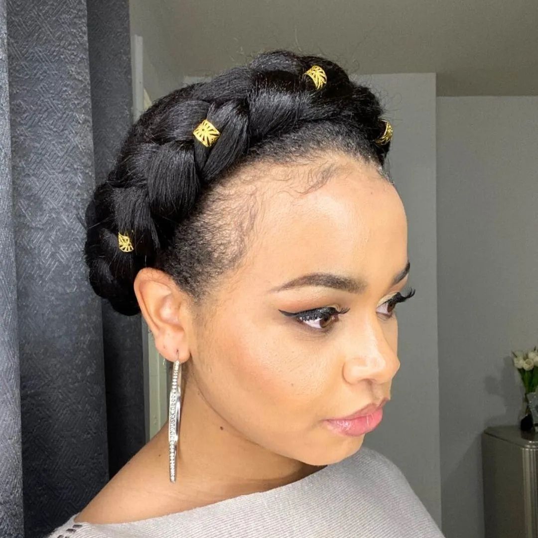 There is a crown braid around your head. To put it festively, you can adorn it with thin thread glitter or small pieces of gold and silver. The fashion appears like an elegant style used in parties or family portraits. It is effective on long and black hair of medium length. The braid secures the hair quite organised and brings a kingly effect to your appearance. It is wearable with loose curls at the back of the head to add an extra classiness. This hairstyle reflects so beautifully in your black hair when the weather is Christmas.