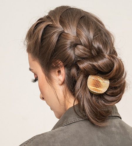 The side sweep style is a glitzy version to wear during a formal occasion or even on a date night. Pull all your hair to one side and fasten it at the base with a medium or large claw clip. Let some of the loose curls or face-giving pieces make the appearance softer. The style suits long, wavy hair best and makes it especially romantic and dramatic. Wear it with statement earrings/necklace to add more grace. To add a touch of glam, go for a rhinestone, pearl, or metallic-adorned claw clip. So labor-intensive to make but so high-tech.