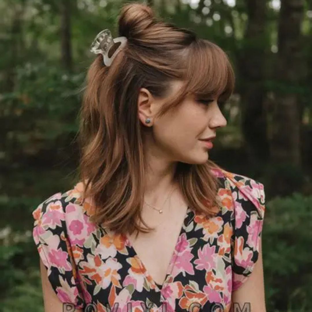 Half-up bun is ideal for adding volume and texture to short hair. Take half of your hair and twist it into a small bun, and hold it down using a bobby pin. Wear the remaining hair long to get a more casual but stylish appearance. The style is very effective on casual outings, college, or even date nights. To add an additional touch of stylishness, twist the ends of the loose hair a bit or apply a fashionable and decorative claw clip of a distinctive design. It is fast, simple, and ideal when you want to appear easily stylish without wasting a lot of time.