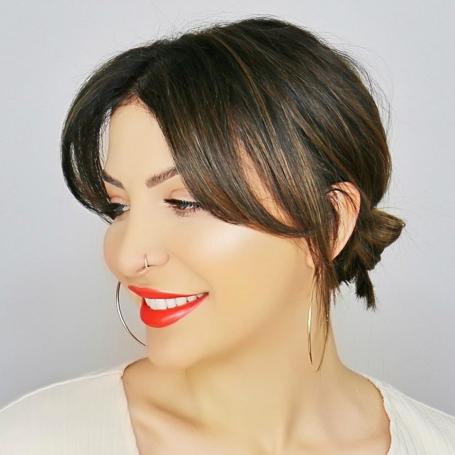 Pull all of your hair onto the back of your neck and roll it into a low bun. A claw clip will fix the bun, which would then be allowed to fall naturally on the curtain bangs to frame your face. This hairstyle is classy and suits the office or meetings, or formal occasions. A loosening of the bun will create a chill-out effect, whereas ornamental claw clips will give the bun an event-ready look. Curtain bangs lessen your features and make them prettier. It is an ideal look with straight, wavy, or slightly curly hair texture and may be recreated within minutes.