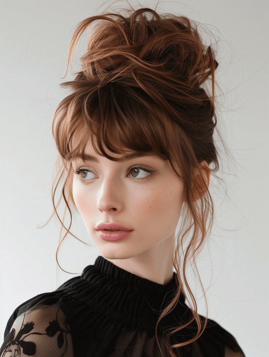 Do a messy updo, even loose, by twisting up the hair and keeping it up with a claw clip at the back. Keep bangs and a few bangs on the face, although to make it soft, playful. This carefree appearance is best used on casual events, brunches, or on weekends. The unkempt style is voluminous and textured, whereas bangs are fresh and lively to the face. The looseness of the updo can be changed according to various occasions. The style is maintained by lightweight claw clips that do not tug at your hair.