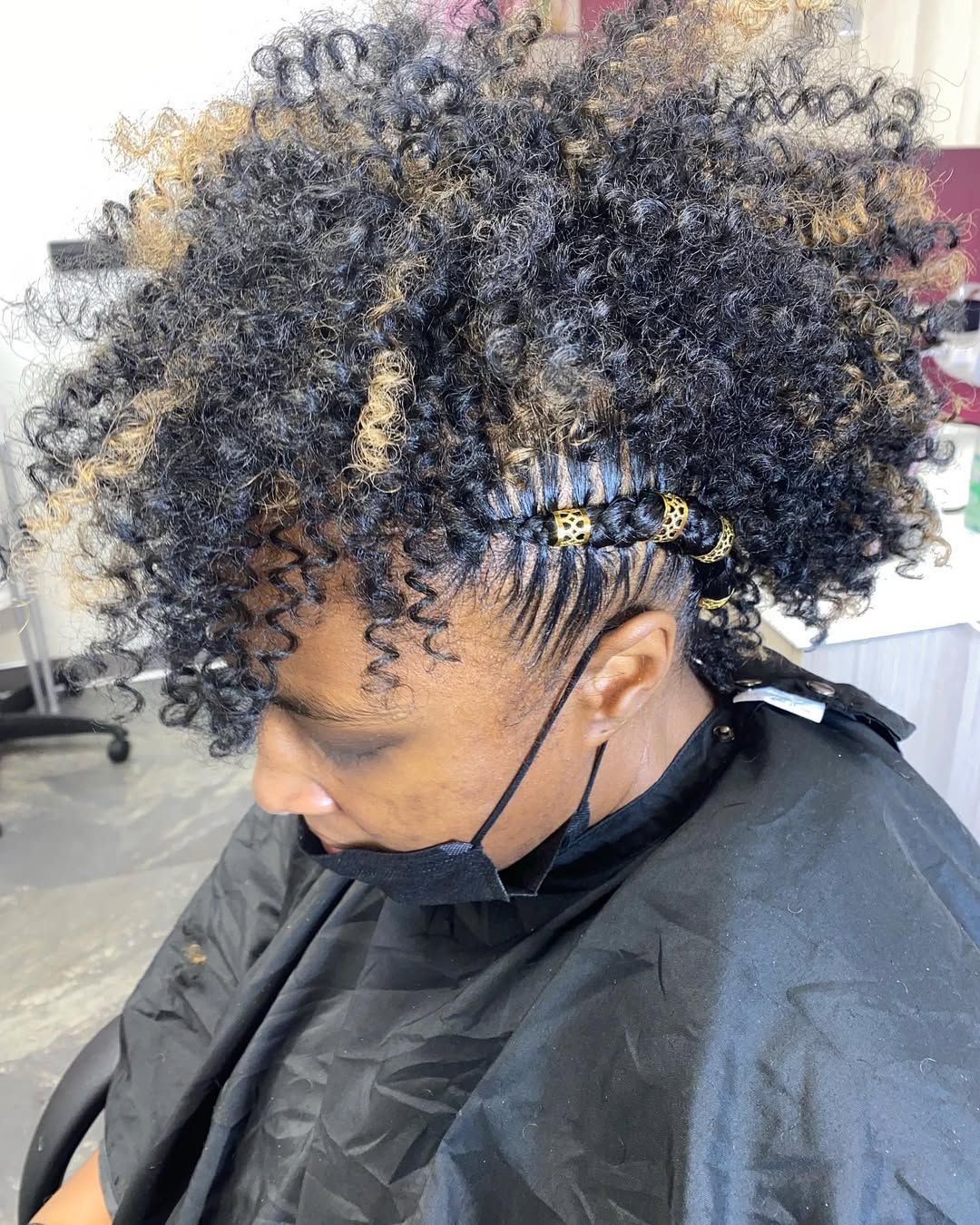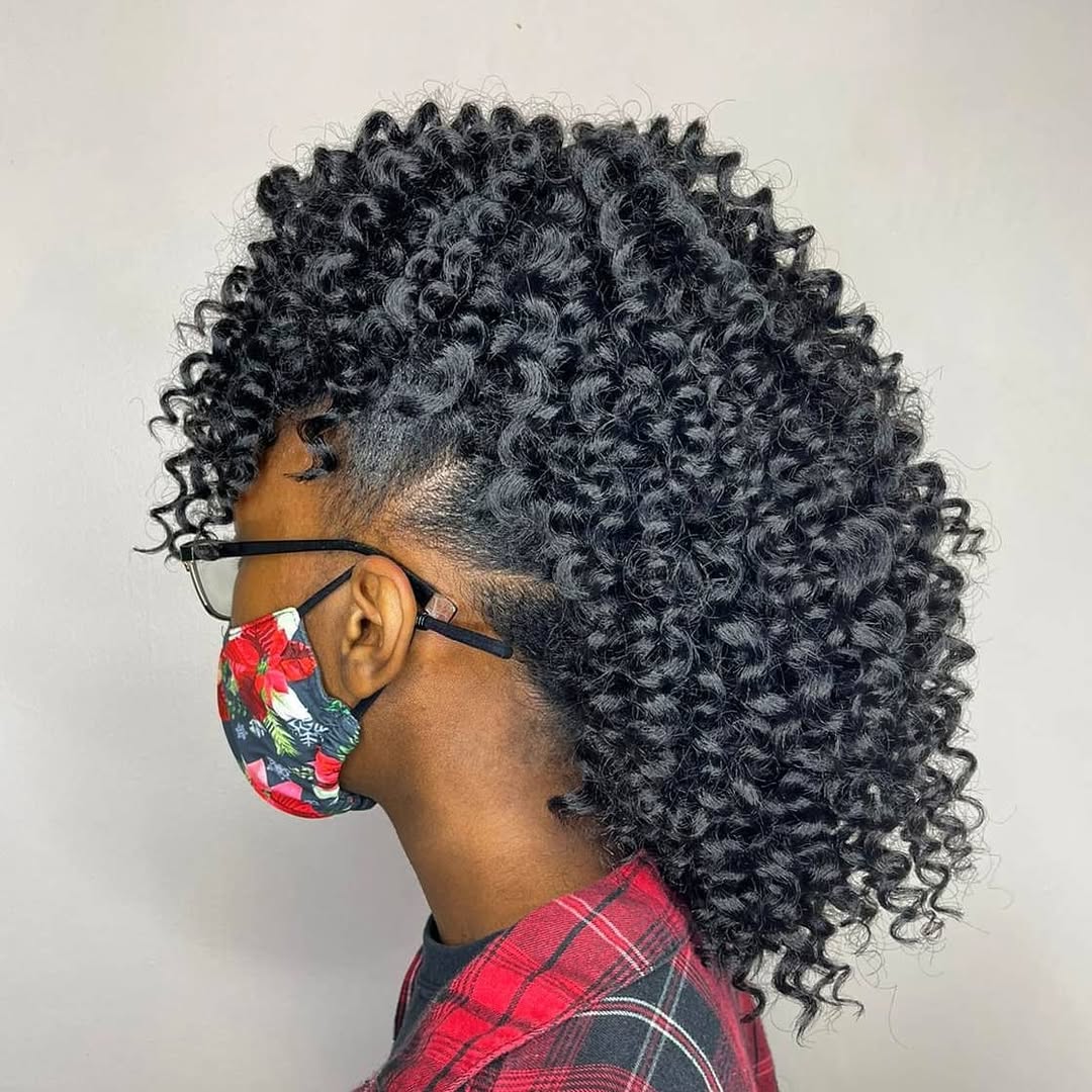 Curly crochet mohawk would be ideal when one desires volume and texture. The middle part of the head is pulled in the form of curls, tight or loose, and the sides can be braided, they can be in the form of cornrows, or they can be natural. The hairstyle is a funky yet daring style, which would be best suited at a party, on an outing, or at a festival. Curly crochet mohawks are used to keep natural hair safe against heat and other chemicals and give it a dramatic look. You can also add highlights or an ombre effect to the curls so that they stand out. With frequent moisturizing and night protection by a satin scarf or bonnet, it is easy to maintain.