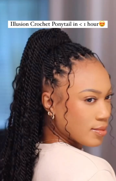 The curly crochet ponytail is a stylish and casual hairstyle that can be used on almost every occasion and in high or low form. The curls are pulled back into a smooth ponytail, and the volumizing texture is retained. It has excellent fitness wear, comfortable, or even work attire with an elegant, but fun appearance. The elastic can always be disguised by wrapping a tiny bit of hair around the base, producing a high finish. The style holds the hair in place, eliminates tangling, and preserves the curl. Light sprays or leave-in conditioners would make the ponytail look fresh and energetic throughout the day.