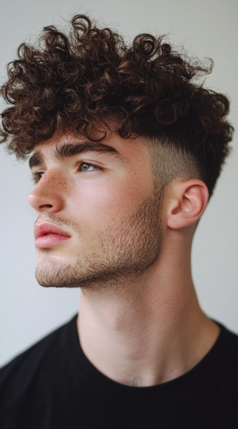 Fade and curly pompadour is a contemporary popular hairstyle among men who adore attention to contrasts. The fade, be it low, mid, or high, just fades smoothly into short sides and voluminous curls on the top. This brings order and balance, and your curls seem to be more defined and natural. Styling is done by blow-drying with a iffuser and applying a cream that gives the twist to the hair. The fading gives a new modern touch to the old-style pompadour, which is ideal in workplaces or street styles. It is daring, clear, and eye-catching– perfect for those people who need to express their curls and boldness.