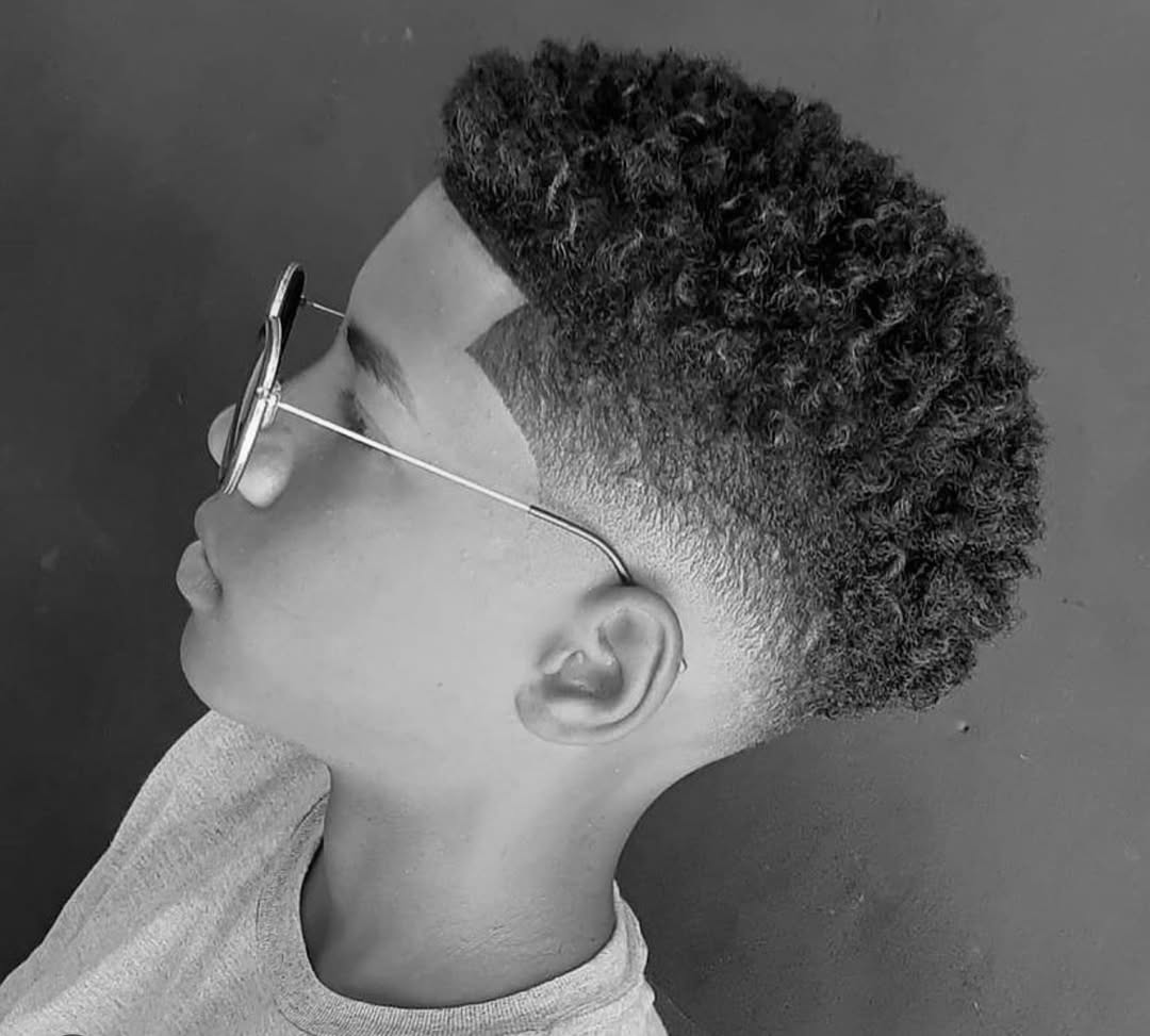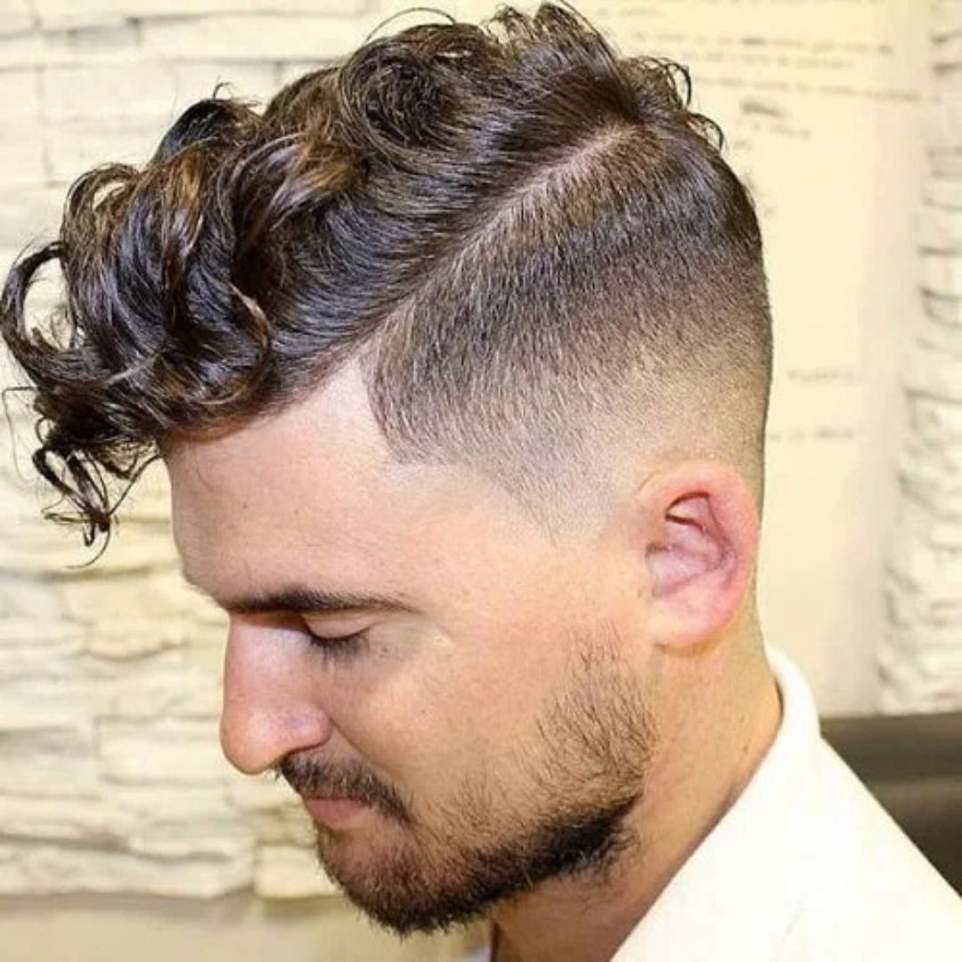 The drop fade and curly pomp add a clean and modern feel to the classic style. The drop fade curves are automatically formed around the ear and neckline, and they fuse with the plentiful curls at the top. This curved addition adds the natural curly hairstyle texture and provides the hairstyle with a professional look. In order to style, apply a light mousse and diffuse to go up. This is a fashionable, but not overwhelming, choice that has been enhanced with the drop fade. Fits perfectly with men who wish to have a haircut that is not too flashy.
