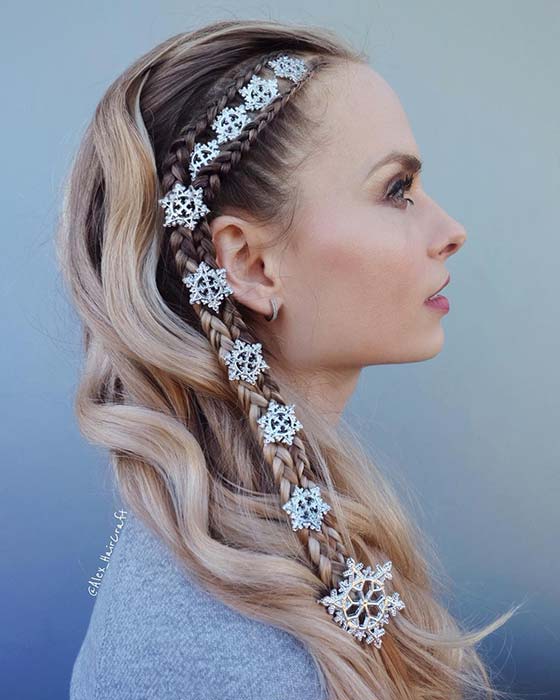 This is a simple hairstyle that is quite sweet and elegant to make. Get a bit of one of your ears of hair, and plait it back. Go ahead and have the braid cross over your head as a headband and secure it on the other side using bobby pins. You may leave the rest of your hair down or twist the ends a little. Add a ribbon, star clip, or snowflake pin to make it look like Christmas. It suits long and medium hair and matches well with any party dress.