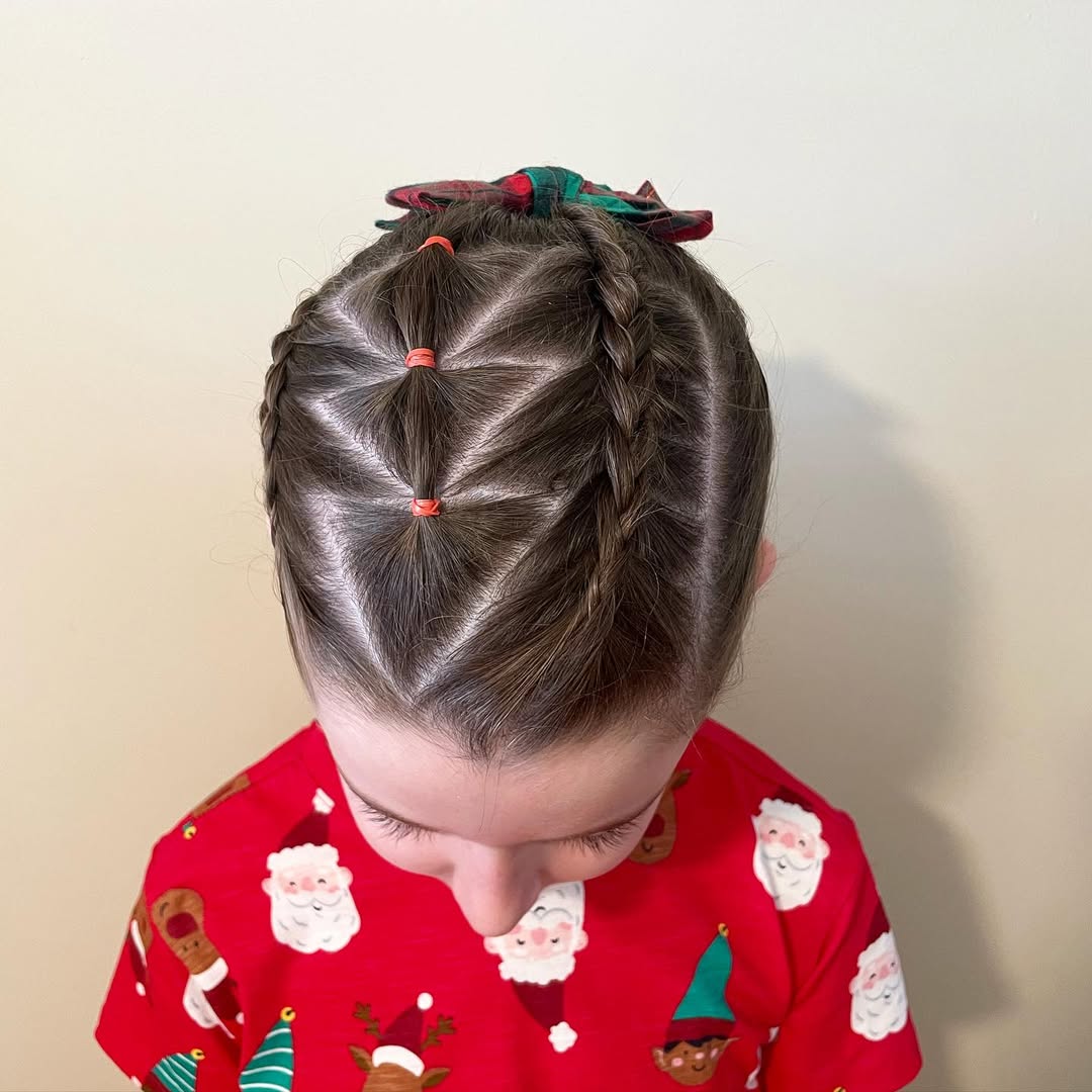 It is a hairstyle that resembles a tiny Christmas tree. Begin by French braiding in the centre of your hair. Take little bits at a time off on both sides of the braid and form the figure of a tree. After the shape is completed, adorn the braid with tiny clips, colored pins, or a little star on the top. You wish you had additional glitzsoen take a green ribbon and thread it through the braid. This hairstyle is suitable for long or medium hair and provides a special festive appearance that is ideal for a school party.