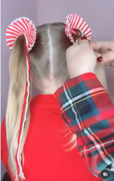 This is a jovial hairstyle that is based on a candy cane. Separate your hair in the middle and have two ponytails. Get red and white ribbons and loop them around each ponytail, making a candy cane effect. Tie the ends using small elastics. You may add some glitter spray to it to make it more festive. It is fast, adorable, le and it does not depend on the length of the hair. This hairstyle would be ideal with little children or adolescents who wish to have a light, colorful, and happy hairstyle for their Christmas school party or ordinary classroom celebration.
