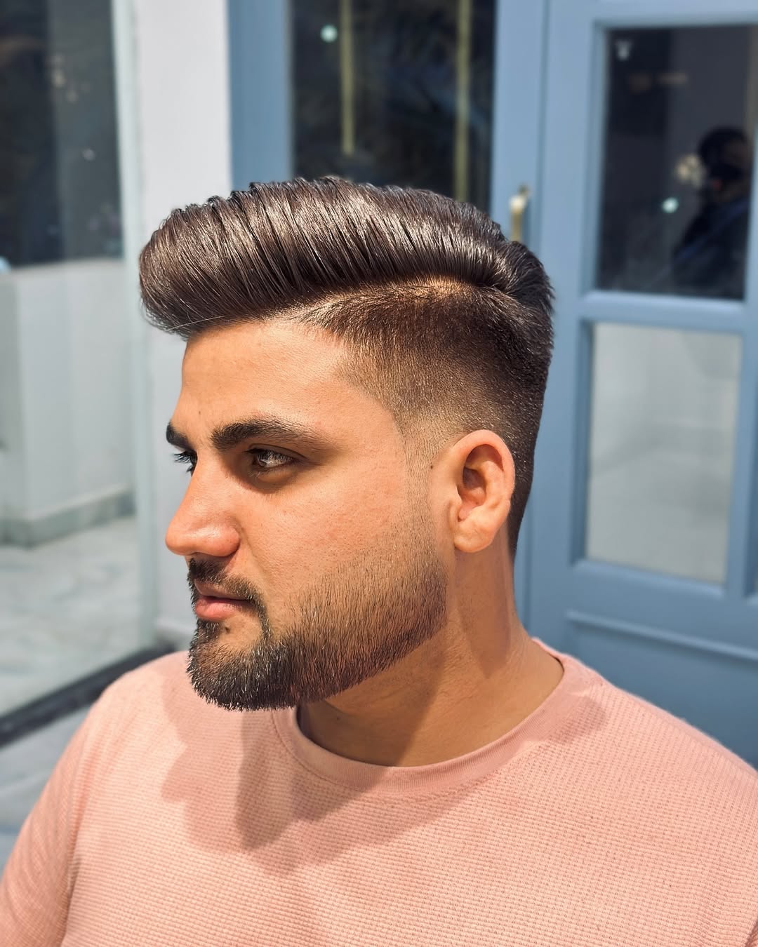 Fade Pompadour Haircut – It is a trendy blend of old-fashioned class and modernity, making it one of the most popular hairstyles among men at the moment. This modern form of the classic pompadour of the 1950s, with a clean fade on the sides and back, maintains the classic appearance with a modern twist, a particular hairstyle made famous by such celebrities as Elvis Presley and James Dean. The top of the hair is thick and swept back, forming a huge volume, which fades in the shorter length, creating a sharp opposition and smooth end.