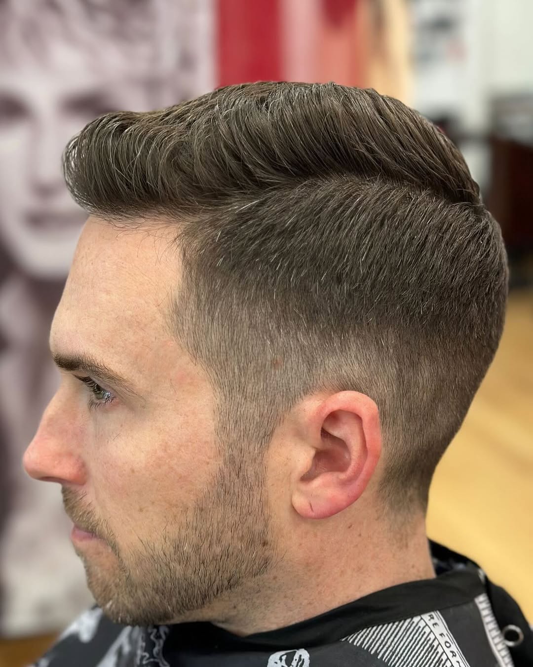 The Long Top Fade Pompadour is concerned with the volume and the drama, which entails much longer hair on the top to create a high-impact effect. The dull sides add to the perception of height and are perfect for men with a preference for bold and voluminous hairstyles. Frequent blow-drying and a styling gel with high hold can be used to hold it. The haircut is ideal with men with thicker hair and an Oval or rounded face. The long top fade pompadour is truly a style that garnered attention irrespective of the location, and it combined creativity, confidence, and a classical style into a single iconic fashion style.