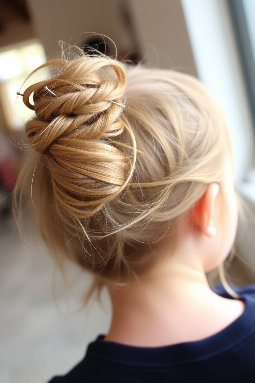 Messy buns are, to be honest, a lifesaver. I usually gather all the hair on top, twist it loosely, and secure it with pins. I’ve found that embracing the messy look actually makes it easier—perfect for wiggly kids who hate being still.