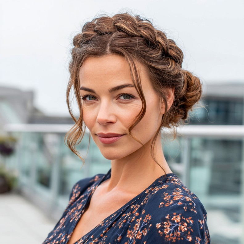 The combination of a braided crown and soft waves makes a romantic and fairy tale appearance of the bride. In the case of women with round faces, a little bit of roundness on the top is necessary to prevent the widening of the face. The waves bring movement and softness to the braid, which is structured. This is the ideal hairstyle to wear during outdoor or garden weddings or destination weddings. The appearance can be improved by light accessories or fresh flowers, which do not overwhelm the face.