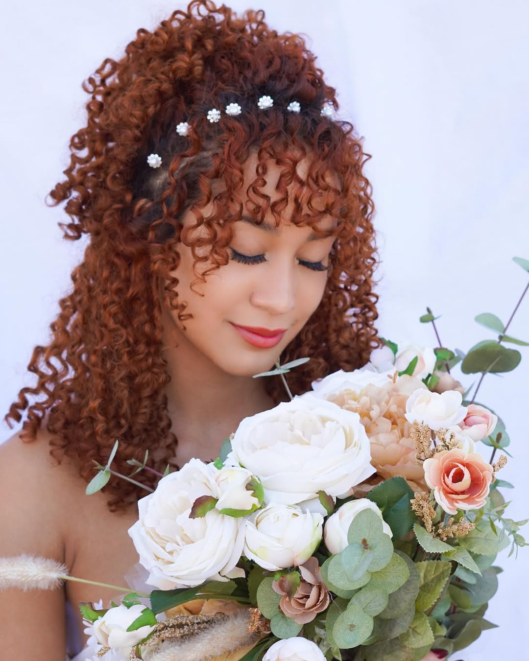 The hairstyle is half-up and half-down,n which is a versatile hairstyle and complementary to round-faced brides. This style lengthens and makes the hair look soft by puffing volume where the hair is at the crown, and letting curls fall freely. It emphasizes the facial features and does not focus on the fullness ofthe cheeks. This hairstyle is suitable to wear with flowered accessories and tiaras or jeweled clips. It applies to both modern and traditional weddings and gives brides the privilege to have the elegance of an updo and retain the beauty of open hair.