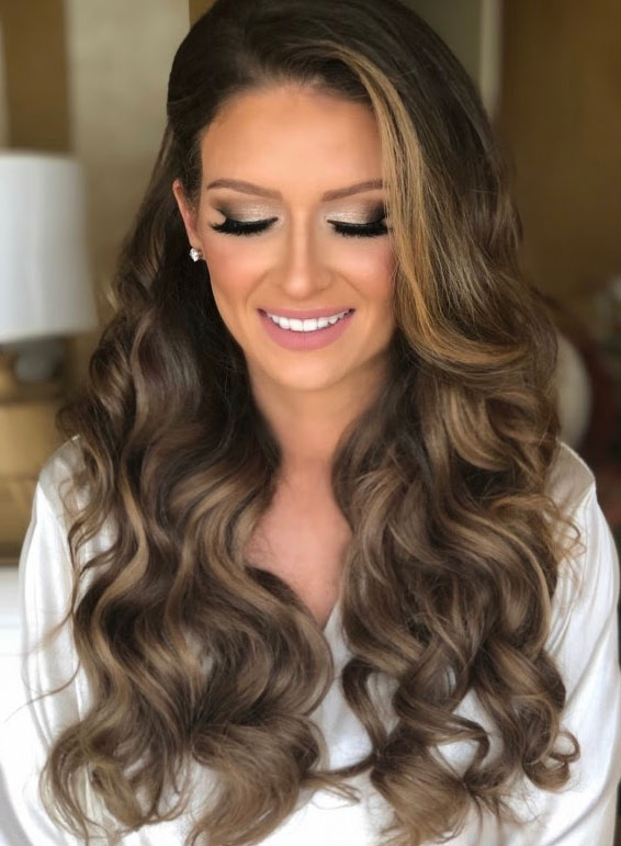 Deep parted loose curls are ideal with brides who like an open and natural appearance. The side element disrupts the symmetry of the face,e and such a round face feels thinner and sharper. Soft curls are sufficient to give it a moving and bulky look without widening the face. This is a daytime hairstyle and destination wedding hair, as well as matches light bridal makeup. It also gives space to bring out earrings and hair accessories without making the overall appearance hard, intricate, and beautiful.