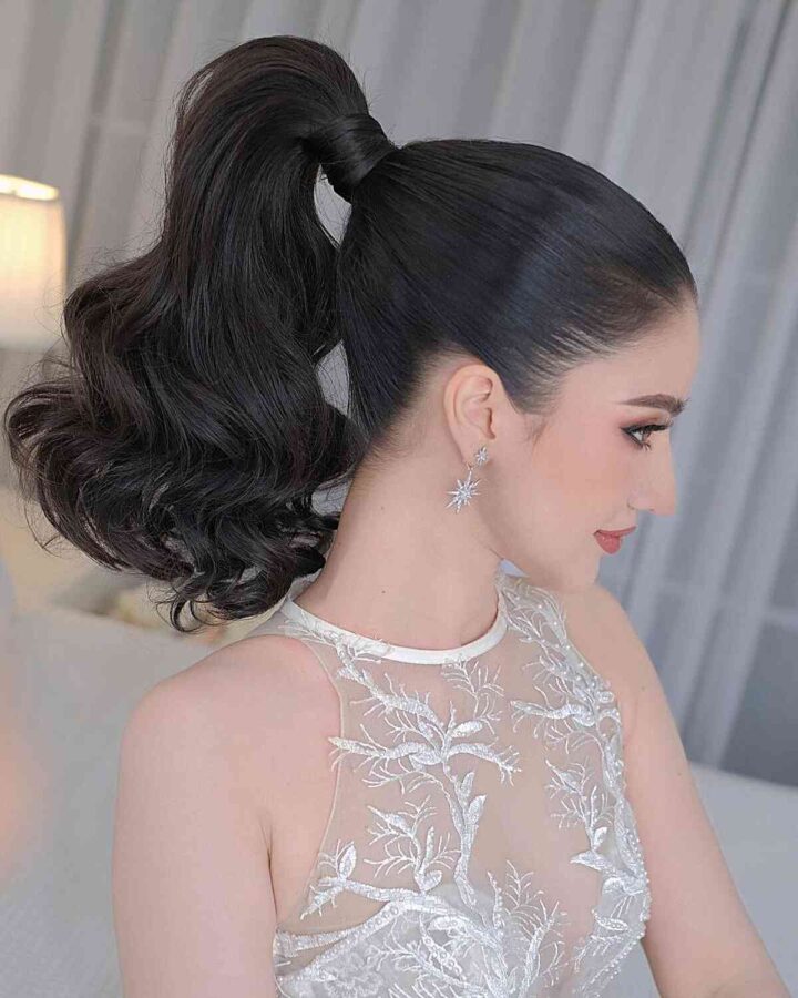 A sleek ponytail with additional volume at the crown is a contemporary and fashionable wedding hairstyle for women with a round face. The top is made tall, which makes the face longer, and the finish is smooth and polished. This hairstyle is complementary to the modern bride’s dresses and earrings. The ponytail has soft waves, which bring motion and femininity. It is a perfect option among brides who want to have a bold and elegant hairstyle that should be outstanding and, at the same time, practical.