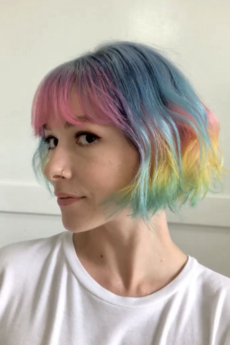 Rainbow hair in pastel is suitafore to creative and adventurous people. Colors such as lavender, mint green, baby pink, and sky blue mix perfectly on theshort hairr,t hair giving it a whimsical and playful effect. Colors can be noticed adistractracting the face with the use of short cuts like pixies or bobs. This type is perfect at festivals, parties, for anyone who wants to theirw the personaaggressivelye way. To keep pastel colors balanced, it is necessary to use mild hair care,color-safe shampoos, and have frequent touch-ups to maintain color vibrancy. Having proper confidence and outlook, pastel rainbow short hair is playful, fashionable, and noticeable.