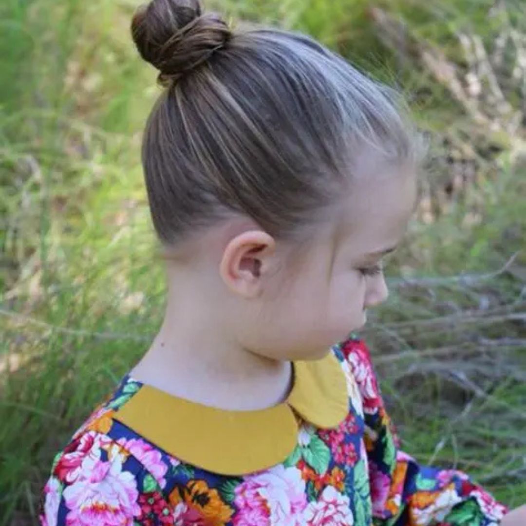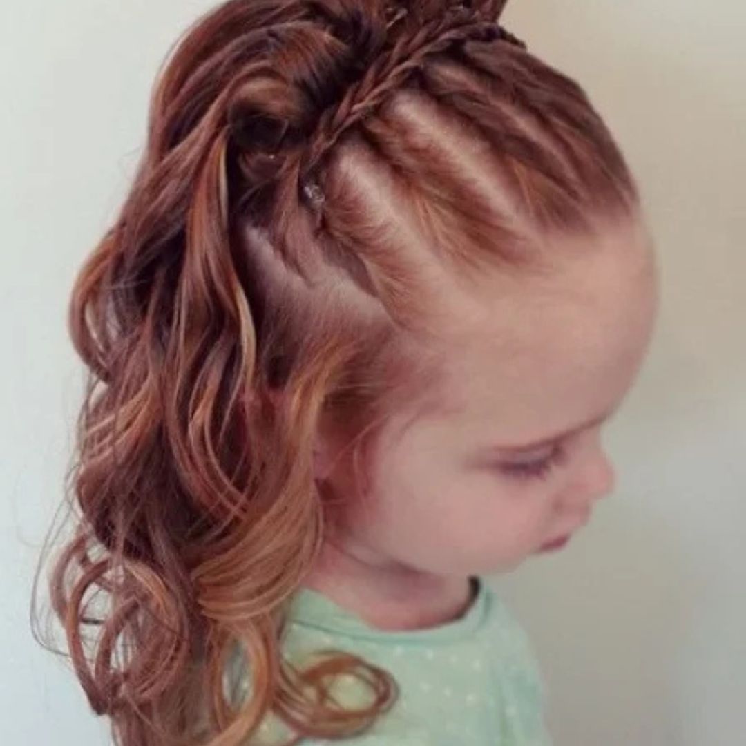The half-up, half-down haircut is an ideal combination of cool and dashing. Only take the upper part of the hair and fix it using a soft elastic or fancy clip, as the rest of the hair is exposed. The hair is away, yet the length and volume are still evident in this style. It goes well with flowery, overlaid, or ruffled frocks. Attach a butterfly clip or a little bow to complete the way cute. The hairstyle can be made easily, and it suits toddlers perfectly, especially toddlers who do not enjoy sitting in a position to be styled.