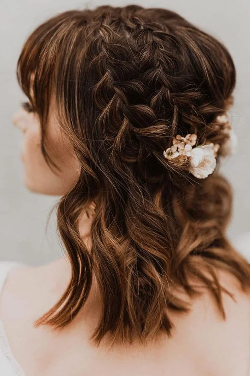 To have a romantic appearance, take the upper part of your short hair and twist it towards the back, taking it lightly. Pin it and adorn the twist with minute flowers. This is also a dimensional style that can be used with layered or short hair on the shoulder. Small pins with flowers, like baby breath or pearl-like floral pins, are used to add value to this hair with a flowery hairstyle. It is ideal during an engagement ceremony or an evening dinner. The half-up cut keeps your hair off your face, but it is voluminous and soft down the back.