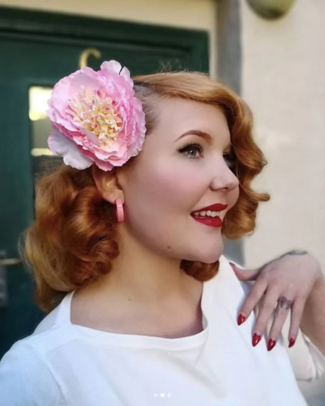 Make the softer vintage-like curls using a curling iron. Toss your hair to one side and fasten it with a flowery clip. This flowered short-hair hairstyle captures the old-Hollywood style and keeps up with the times. It is a marvelous cocktail party or formal attire. Select an old-time flower such as a white rose or orchid. Coupled with the arrangement of curls and a flower, it brings a classic and sophisticated appearance.