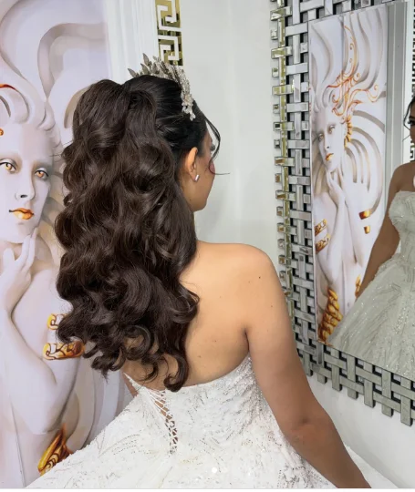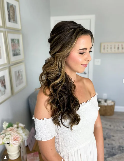 The half-up, half-down style of hair is a compromise between sophistication and easy-going simplicity. The upper part is mounted on the shoulder, which makes soft waves or curling freely, hence suitable for most styles of a gown. It is not too stylish but at the same time romantic and feminine. Small details such as glittering clips or small flowers can be added to increase the glamour a bit. It is also a multifunctional hairstyle, worn both on less formal and even formal occasions, weddings, or proms,s and worn with almost any type of neckline, and thus makes it the perfect choice for customers who desire to wear it both comfortably and stylishly.