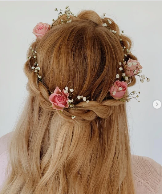 The braided flower crown is the classical and beautiful girlish style. Commence by forming a periwike around the top of the head, fastening it with pins. The braid can be filled with small flowers, such as daisies, baby breath, small roses, etc., creating a rather whimsical and fairy-tale effect. The style is perfect on birthdays, parties, and photoshoots,s and it provides beauty and elegance. The hair is kept in a braid, id and the flowers add a natural ligal touch. It is worn on long and medium-length hair, and can be loosely curled at the end to add an additional romantic impression.