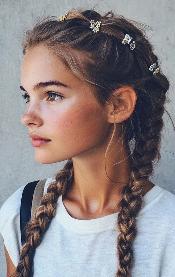 Flower clips in a pack of two braids are childish and amusing. Part the hair and braid each side in a loose manner. To make it look cute and cool, add small flower clips to the braids or at the end. This hairstyle suits well in school eevents festivals, as well as in informal occasions. The flowers provide a touch of fun,n and the hair is kept in place by the double braids. It can be applied to long and medium hair; this style can be done in simple variations, such as twisting the braids or putting on ribbons. It is an adorable style, which is both fashionable and handy among girls.
