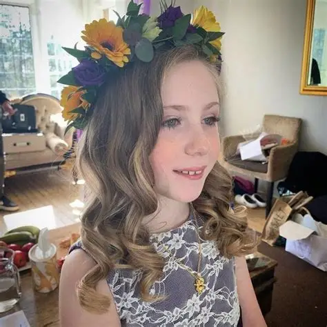 There is a side braid with small flowers, which makes it look delicate and young. Wind the hair in a loose strand to one side and interweave the strand with tiny flowers that may be daisies or baby breath. This is the style that is perfect for school events, outdoor parties,s or informal events. The side braid is a way of keeping the hair in place, but it still has a natural and casual appearance. It has long or medium-length hair and could be combined with curls or waves to add volume. The style gives the girls the opportunity to show their playful and feminine nature, and therefore is ideal in spring and summer events.