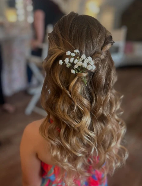 The half-up, half-down hairstyle is a classy and comfortable hairdo. Pull half of the hair that is on the top and leave the rest of the hair loose. Pin and hair tie and tie and bond it with tiny flowers along the parting or bun. This style is ideal for weddings, school, or in the case of a casual outing. The floral accent is also added to the general appearance with the help of the loose hair. It fits girls with straight, wavy,y or curly hair and can be creatively varied (with twists, or ribbons on the pulled-back part, and then the flowers are pinned to it.