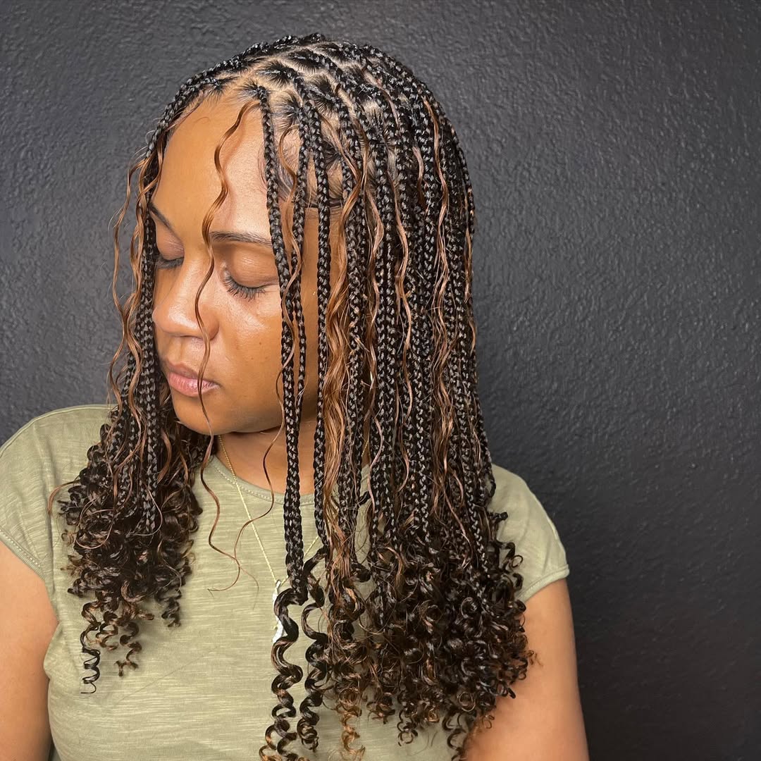 Curly knotless braids provide volume and romanticism to the usual braids. The scalp has smooth, wavy ends of the braid that curve out in the form of fun, feminine looks. The style is ideal at a party, at a wedding o, or on a casual outing because it provides movement and texture to your hair. Knotless braids are available in curly and ombre colors of different sizes to create a personalized look. They are not heavy, they preserve the natural hair,a nd are stylishly versatile. Curly braids are bold with the potential advantages of knotless methods of braiding.