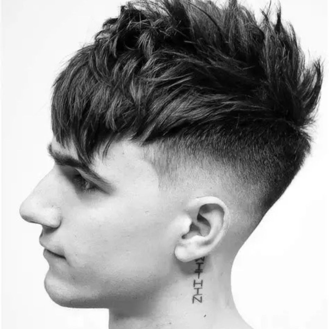 The fade and spiky angular fringe is edgy and fashion-forward, which suits men who desire a bold hairstyle. The fringe is spiky and adds texture to the face and height to it, making it round, and the fade at the sides gives it sharp lines and contours. The spikes need to be styled with a light wax or gel to make them less rigid. This haircut is so versatile; it can be left casual and messy, or it can be done specifically so that it is a polished cut. Angular fringe balances the fullness of the face and offers a well-structured shape. It is ideal among men who would prefer a dynamic and youthful, and fashionable look.