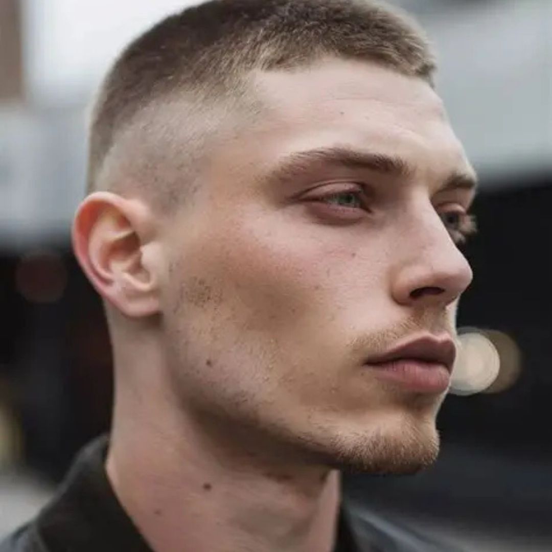 The traditional buzz cut uniform leaves hair at a length on all sides of the head, giving a clean and minimal look. In cases where the man has an inverted triangle face, the style has a tendency to downplay the broad forehead but highlight the jawline. It is low-maintenance and fits men who would have a no-fuss hairstyle. Angular features are also complemented by the uniformity of the cut that ensures symmetry. To improve the balance, it should be combined with short stubble or a well-cut beard. Frequent trims (2-3 times a month) keep the hair at the same length and keep the style clean, memorable, and flattering.
