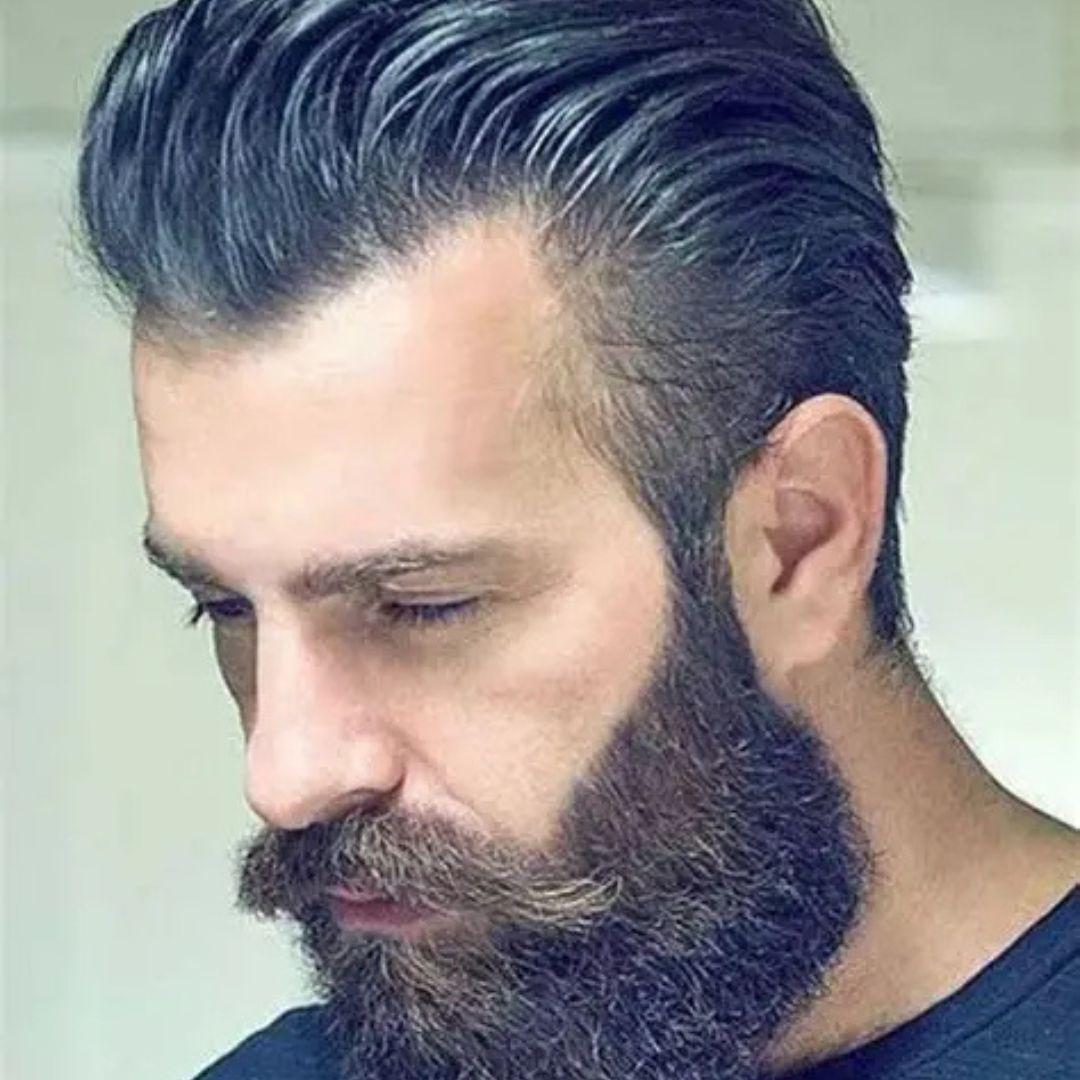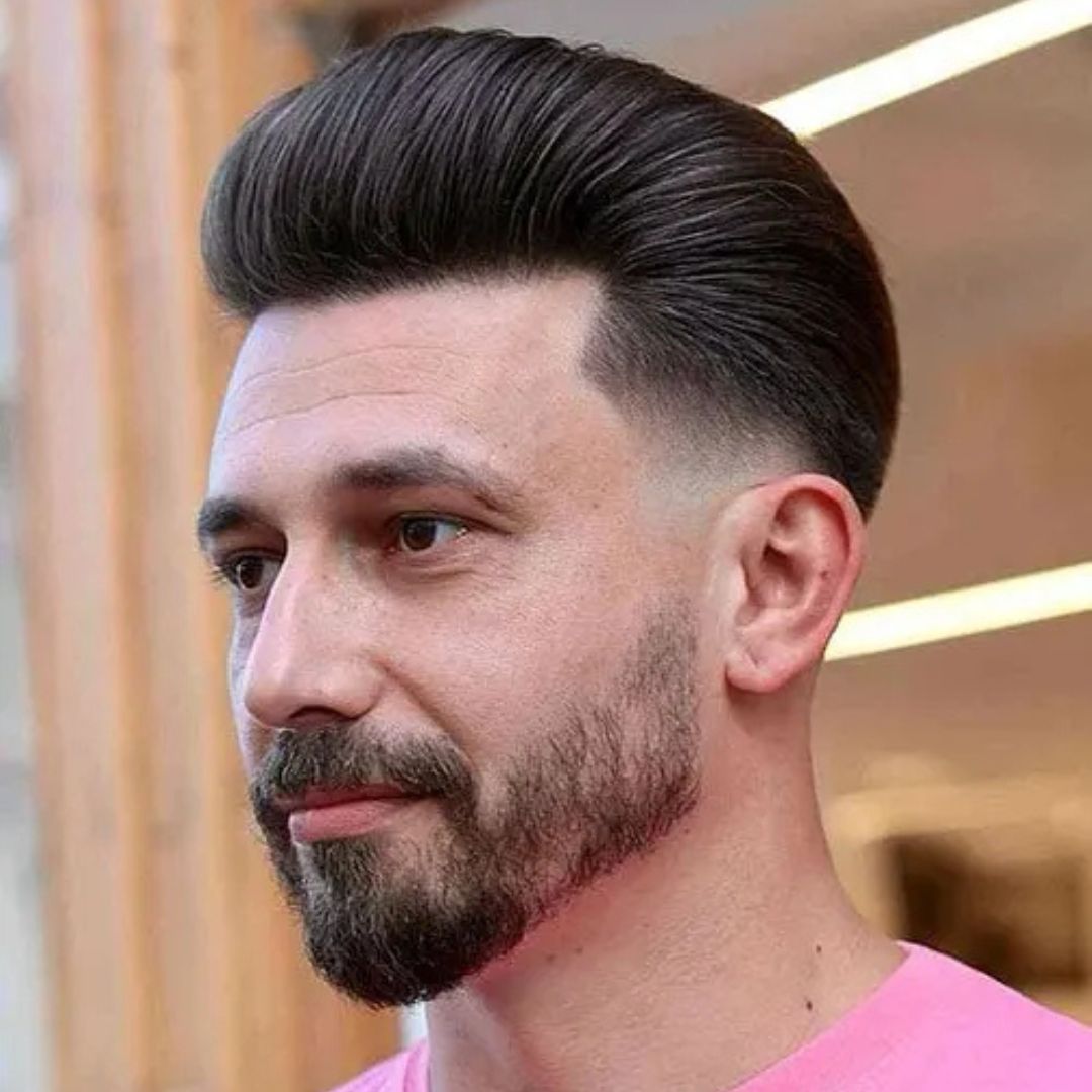 A well-groomed beard combined with a pompadour is a balance to the facial structure and makes one look more masculine. The beard squares off the bottom part of the jaw, and the pompadour lifts the top, op therefore resulting in a balance between proportions. The short faded sides rejoin the lines on the beard fades and the effect is a continuous look. The length of the beard can be changed according to his preference, but the edges are necessary to well-defined. With or without a beard, this mix makes a crass, rough look. It fits perfectly into the minds of contemporary men who seek a trendy yet outspoken character statement that has depth and form.