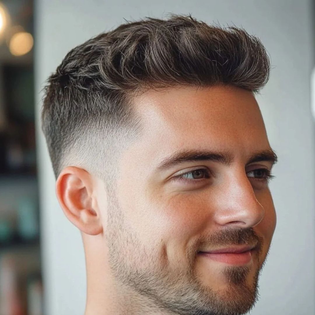 A traditional short beard makes the jaw clean and elegant, which suits the pear-shaped face. When combined with a textured quiff, it gives the upper face some extra volume and a balance between the smaller forehead and the larger jawline. This assortment stresses masculinity and still has a professional appearance. The layered texture of the quiff makes it pull the eyes upwards, creating a lengthening family shape and balancing proportions. It is suitable for both casual and formal events, and also for medium and thick hair. The beard and quiff are trimmed and styled with light-hold products to maintain a sleek, modern look.